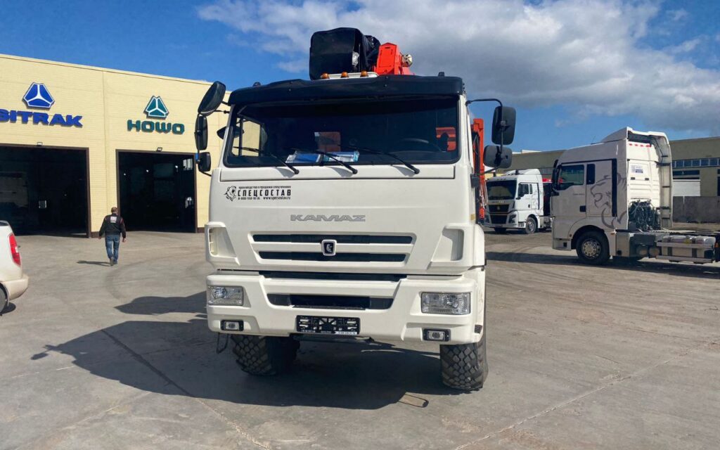 Оснащен проверенным двигателем КАМАЗ 740.705 (300 л.с.), усиленной КПП Камаз-154 и двухбаковой системой (350+210 л) для работы в тяжелых условиях. Вылет стрелы 20,3 м и полноприводная формула 6×6 обеспечивают работу на бездорожье и сложных объектах.